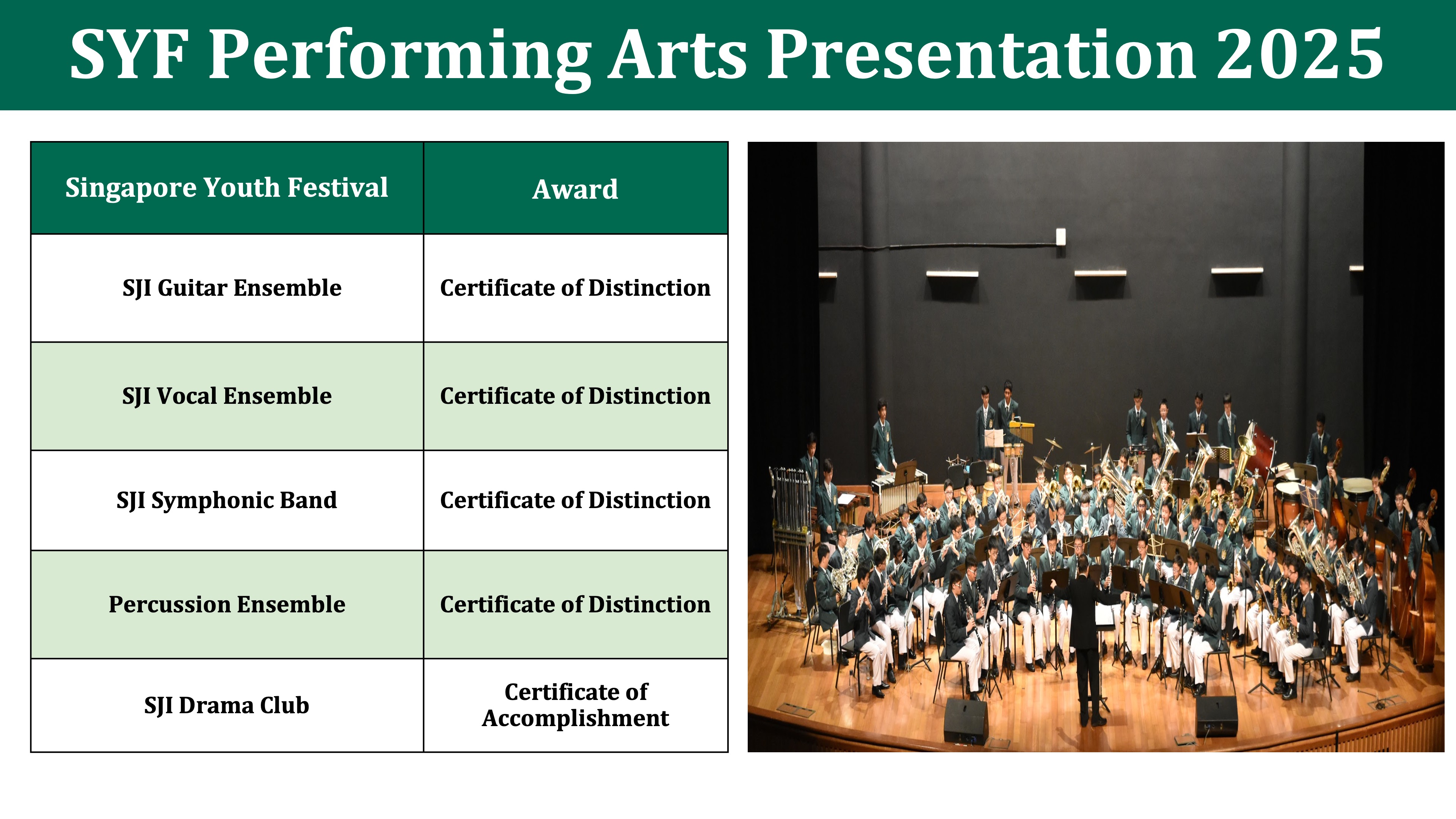 SJI is an established school with an excellent track record in academic and co-curricular activities. The awards below recognize the excellent education that SJI provides its boys. In 2009, SJI received the School Excellence Award (SEA), which is the highest and most prestigious award under the Masterplan of Awards structure instituted in 1998 by the Singapore Ministry of Education.