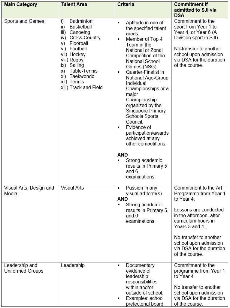 7. SJI DSA-Sec exercise invites applicants for the Singapore-Cambridge Education Certificate Programme (SECP) and the Integrated Programme (IP) in the following categories and talent areas: